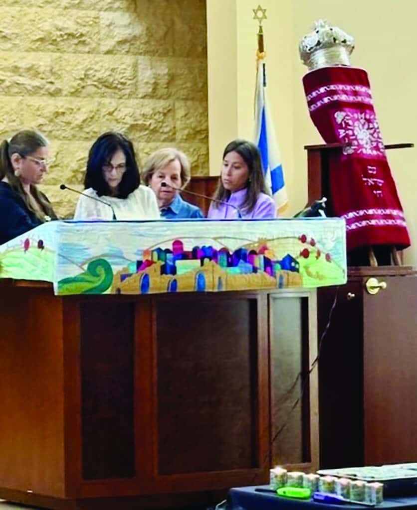 The Vigil began as it customarily has, with the chanting of prayers and a talk by Beth David’s spiritual leader, Rabbi Danielle Bensimhon. In addition, moving and inspirational words were delivered by Scholar-in-Residence Rabbi Debra Eisenman, as well as by Pastor Michael Zdorow of The Gathering Place. This was followed by the lighting of seven memorial candles: six in memory of the six million slaughtered during the Shoah and a seventh in memory of those murdered in the massacre of October 7. This was followed by a screening of the 1995 Academy Award-winning documentary short film One Survivor Remembers, in which the horrors of the Shoah are recounted through the words and story of Gerda Weissman, a woman who lived through it and survived. Individuals and families then began to read the names of Jewish victims of the Nazis and their cohorts. Art created by Jewish children martyred in the Holocaust as well as photos of Jewish partisan groups were on display in the temple sanctuary, and images of pre-war Jewish life in Europe were projected on the walls while ambient music provided a counterpoint to the ongoing recitation of names.