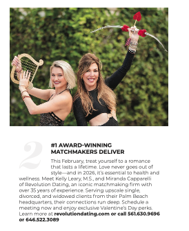 Successful, single, divorced, and widowed clientele are increasingly choosing to live—and love—offline. In a world that feels more digital than ever, the desire for real connection has never been stronger. Revolution Dating is a full-service matchmaking firm specializing in the discreet screening and representation of clients from up and down the coast of the USA. With decades of combined experience, our reach continues to grow alongside our clients’ lifestyles. Corporate brick-and-mortar office located right here in the exclusive PGA Commons, Palm Beach Gardens remains our home base, but love knows no boundaries!